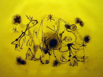 米罗的好奇和兴趣在于对自然的主观观察。他对版画世界的把握和理 解, 随着他对田野中的叶子和草的茎节的深人研究而越益开拓和发展。正是这种专致的视觉促成了重复最多、也是 最具 重复性的特性, 他那艺术语 言的隐喻性 萌发第一批春芽, 并且生出了形成 他所有作品的目标和愿望的根基。这种最早的运用成为了独出心裁的专利, 以后甚至在他的晚期铜 版作品 中也体现出来。以后米罗越来越发现有必要拓宽自己的版 画资源 , 他逐渐转 向铜版 。 看过他的各种样式作品的观众, 如果说是一些缺乏判断力却是非常忠实的观众, 也会同声唱赞歌: 他是如此长于此技 ! ⋯⋯ 他了解得如此深 ! ⋯⋯